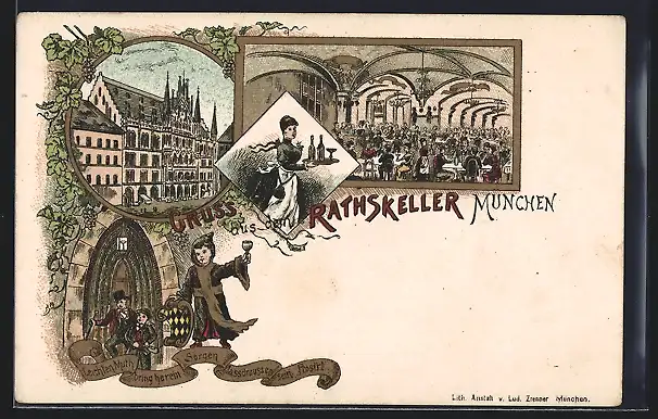 Lithographie München, Rathskeller, Aussen- und Innenansicht und Münchener Kindl