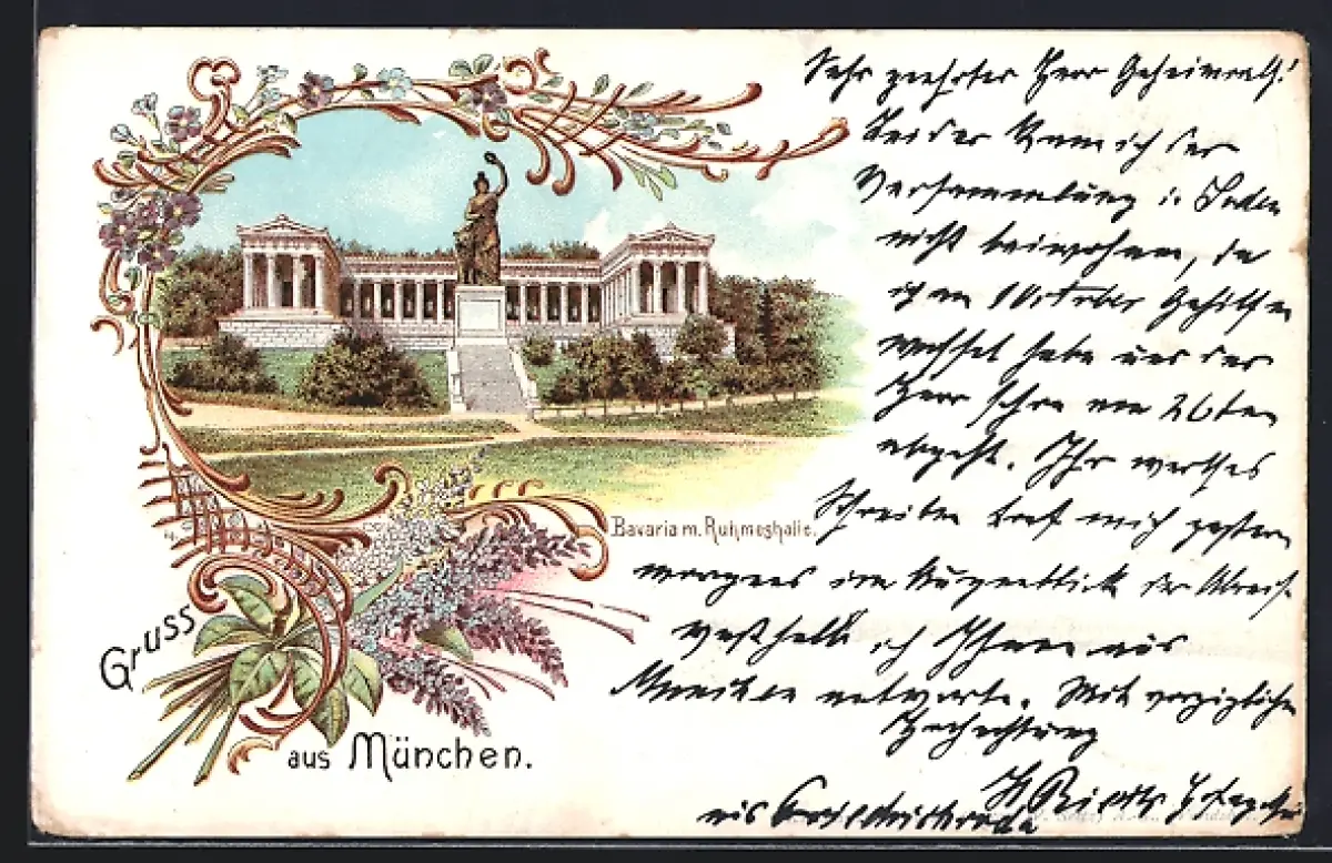 Lithographie München, Ruhmeshalle mit Bavaria, Ornament-Rahmen