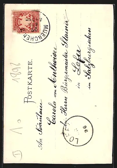 gelaufen 1896, Eckknick und Bugspuren rechts oben, guter Zustand