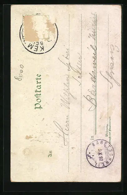 Personenbezogene Daten auf der Rückseite der Karte wurden durch blauen Textmarker unkenntlich gemacht. Die blauen Stellen sind auf die Vorderseite durchgeweicht und wirken sich negativ auf das Postkartenfoto aus