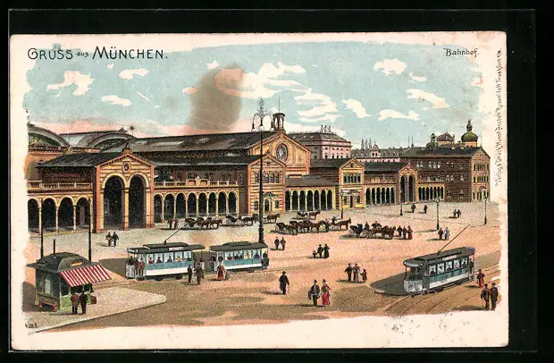 Lithographie München, Strassenbahnen halten vor dem Bahnhof