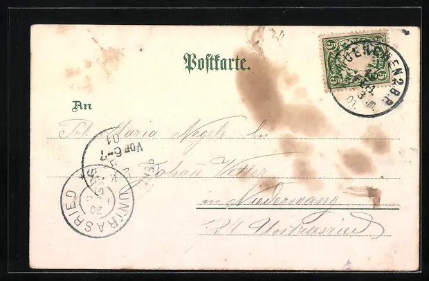 Personenbezogene Daten auf der Rückseite der Karte wurden durch blauen Textmarker unkenntlich gemacht. Die blauen Stellen sind auf die Vorderseite durchgeweicht und wirken sich negativ auf das Postkartenfoto aus