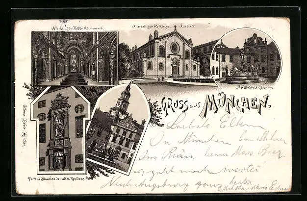 Lithographie München, Wittelsbach-Brunnen, Allerheiligen-Hofkirche
