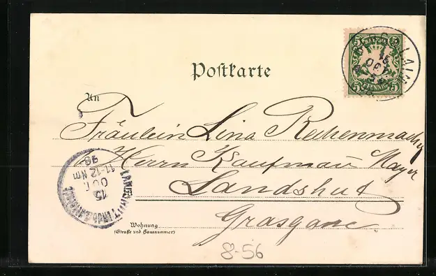 Personenbezogene Daten auf der Rückseite der Karte wurden durch blauen Textmarker unkenntlich gemacht. Die blauen Stellen sind auf die Vorderseite durchgeweicht und wirken sich negativ auf das Postkartenfoto aus