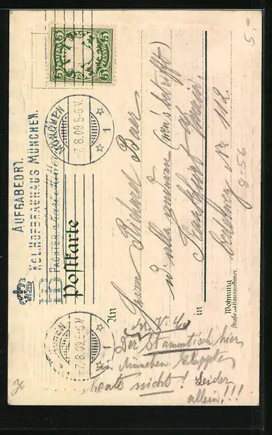 Personenbezogene Daten auf der Rückseite der Karte wurden durch blauen Textmarker unkenntlich gemacht. Die blauen Stellen sind auf die Vorderseite durchgeweicht und wirken sich negativ auf das Postkartenfoto aus