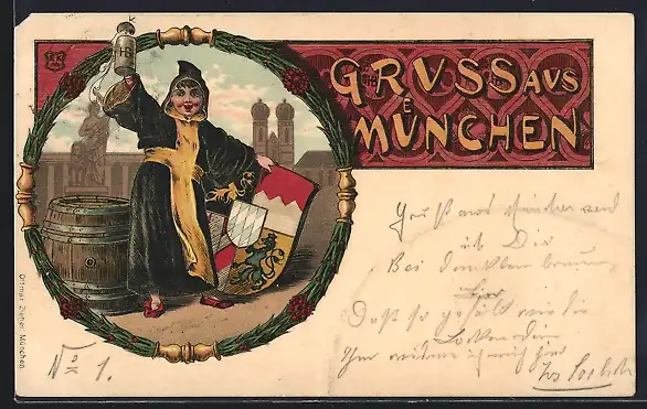 Lithographie Münchner Kindl mit Bierkrug und Wappen
