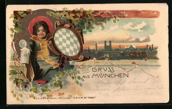Lithographie Münchner Kindl mit Wappen und Bierkrug