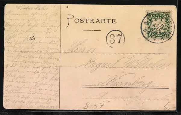 Personenbezogene Daten auf der Rückseite der Karte wurden durch blauen Textmarker unkenntlich gemacht. Die blauen Stellen sind auf die Vorderseite durchgeweicht und wirken sich negativ auf das Postkartenfoto aus
