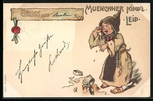 Lithographie Münchner Kindl weint über zerbrochenen Bierkrug