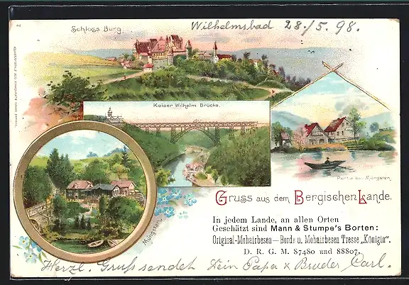 Lithographie Müngsten, Kaiser Wilhelm Brücke, Schloss Burg
