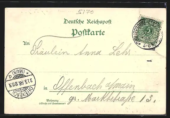 Personenbezogene Daten auf der Rückseite der Karte wurden durch blauen Textmarker unkenntlich gemacht. Die blauen Stellen sind auf die Vorderseite durchgeweicht und wirken sich negativ auf das Postkartenfoto aus