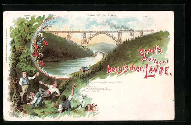 Lithographie Müngsten, Kaiser Wilhelm Brücke mit Fluss