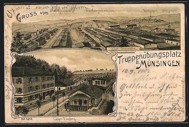 Lithographie Münsingen, Truppenübungsplatz, Lager Eingang und Barackenlager