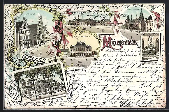 Lithographie Münster i. W., Königliche Akademie, Kaiserliches Postamt, Bahnhof