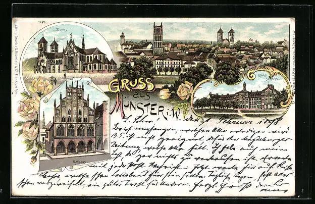 Lithographie Münster i. W., Totalansicht mit Dom und Rathaus