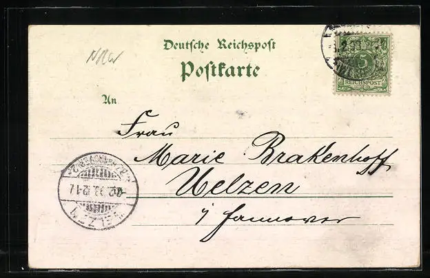 Personenbezogene Daten auf der Rückseite der Karte wurden durch blauen Textmarker unkenntlich gemacht. Die blauen Stellen sind auf die Vorderseite durchgeweicht und wirken sich negativ auf das Postkartenfoto aus