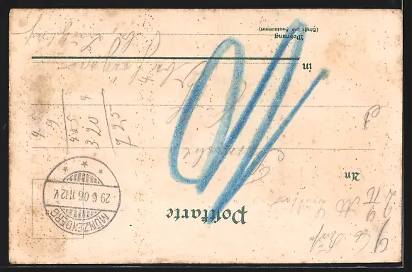 Personenbezogene Daten auf der Rückseite der Karte wurden durch blauen Textmarker unkenntlich gemacht. Die blauen Stellen sind auf die Vorderseite durchgeweicht und wirken sich negativ auf das Postkartenfoto aus