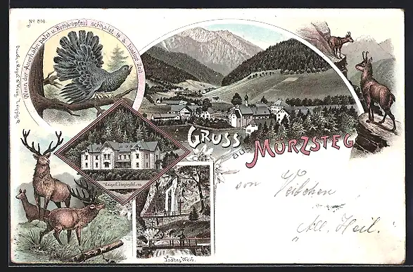 Lithographie Mürzsteg, Kaiserl. Jagdschloss, Todtes Weib, Ortsansicht