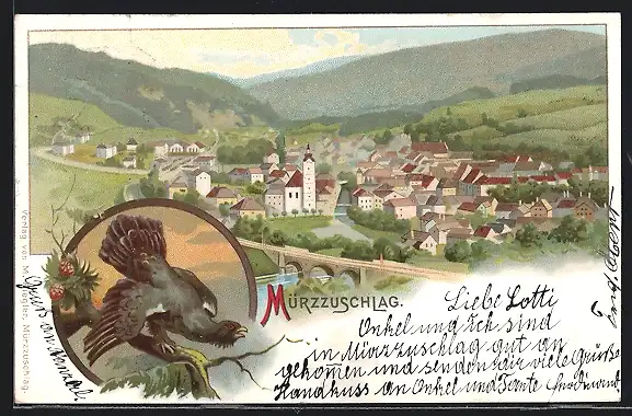 Lithographie Mürzzuschlag, Teilansicht, Vogel auf einem Ast