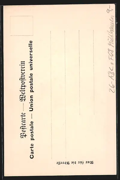 Personenbezogene Daten auf der Rückseite der Karte wurden durch blauen Textmarker unkenntlich gemacht. Die blauen Stellen sind auf die Vorderseite durchgeweicht und wirken sich negativ auf das Postkartenfoto aus