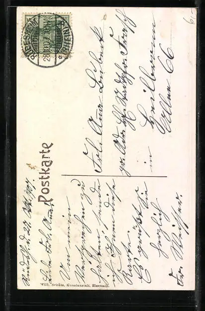 Personenbezogene Daten auf der Rückseite der Karte wurden durch blauen Textmarker unkenntlich gemacht. Die blauen Stellen sind auf die Vorderseite durchgeweicht und wirken sich negativ auf das Postkartenfoto aus