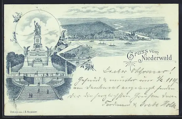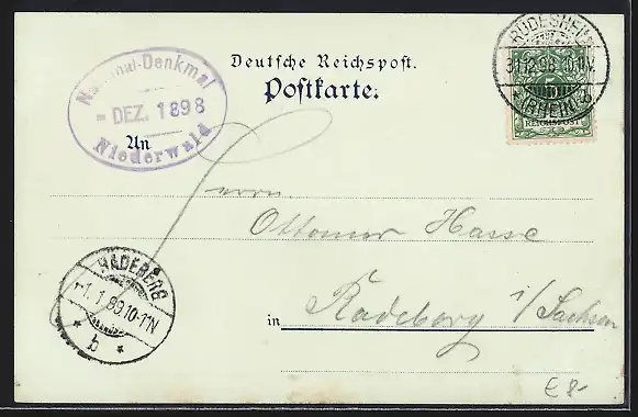 Personenbezogene Daten auf der Rückseite der Karte wurden durch blauen Textmarker unkenntlich gemacht. Die blauen Stellen sind auf die Vorderseite durchgeweicht und wirken sich negativ auf das Postkartenfoto aus