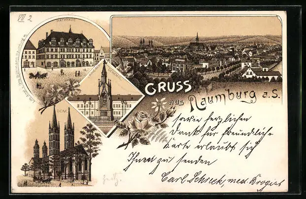Lithographie Naumburg a. S., Rathaus, Kriegerdenkmal, Dom, Totalansicht