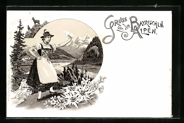 Lithographie Nebelchorn, Blick in die Berge, Mädchen im Tracht