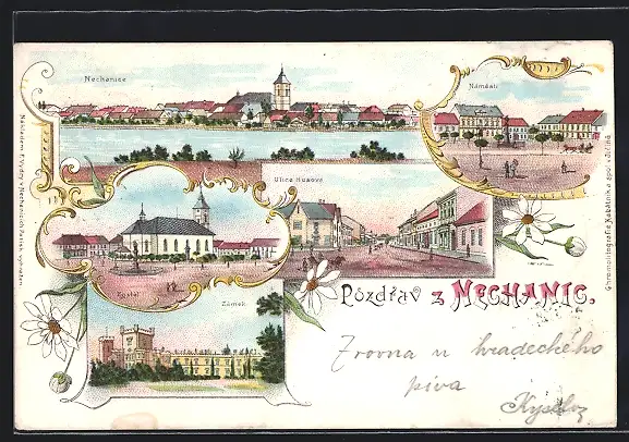 Lithographie Nechanice, Ulice Husova, Namesti, Zamek, Kostel