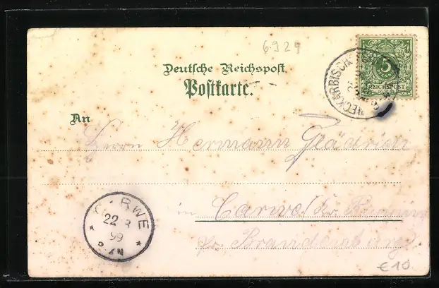 Personenbezogene Daten auf der Rückseite der Karte wurden durch blauen Textmarker unkenntlich gemacht. Die blauen Stellen sind auf die Vorderseite durchgeweicht und wirken sich negativ auf das Postkartenfoto aus