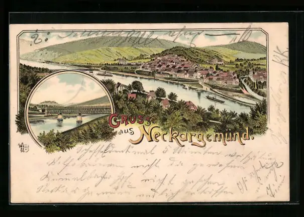 Lithographie Neckargemünd, Teilansicht, Brücke