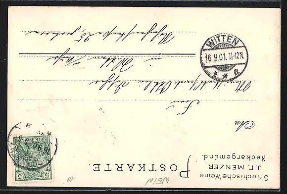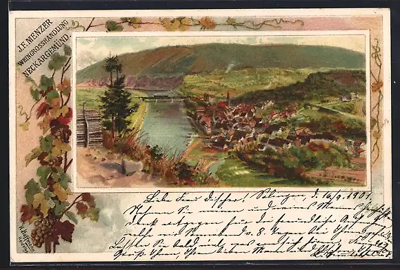 Lithographie Neckargemünd, Teilansicht, J. F. Menzer Weingrosshandlung