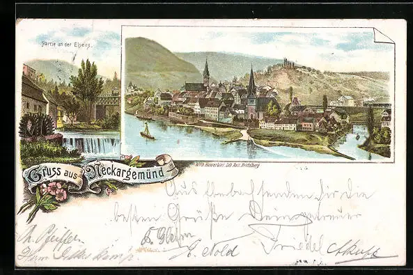 Lithographie Neckargemünd, Teilansicht, Partie an der Elsenz