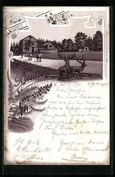 Lithographie Nesselberg, Ortspartie mit Hirschen