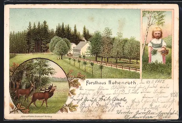 Lithographie Netphen, Blick zum Forsthaus Hohenroth, Blondes Mädchen