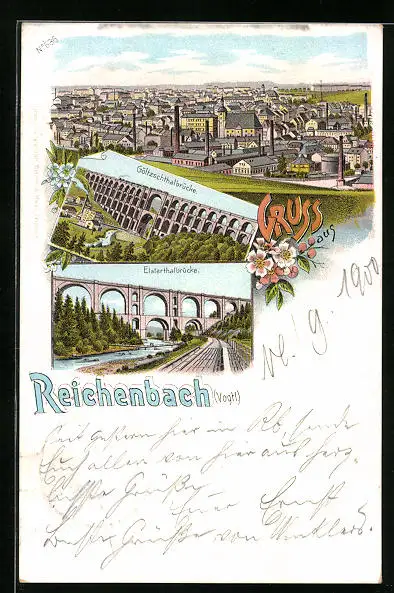 Lithographie Netzschkau, Totalansicht, Göltzschthalbrücke und Elsterthalbrücke