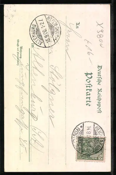 Personenbezogene Daten auf der Rückseite der Karte wurden durch blauen Textmarker unkenntlich gemacht. Die blauen Stellen sind auf die Vorderseite durchgeweicht und wirken sich negativ auf das Postkartenfoto aus