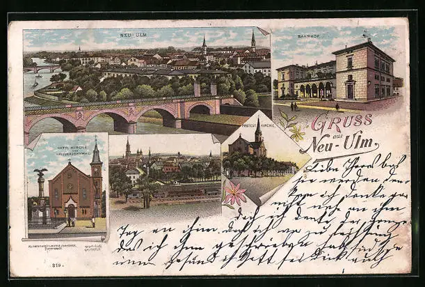Lithographie Neu-Ulm, Bahnhof, Protest. Kirche, Totalansicht