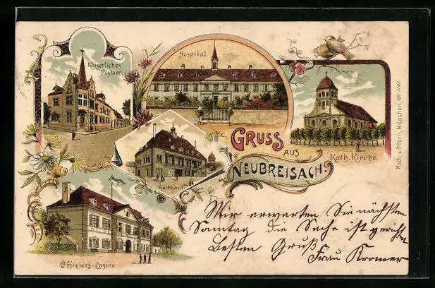 Lithographie Neubreisach, Kaiserl. Postamt, Hospital, Rathaus