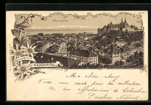 Lithographie Neuchatel, Ortspanorama aus der Vogelschau