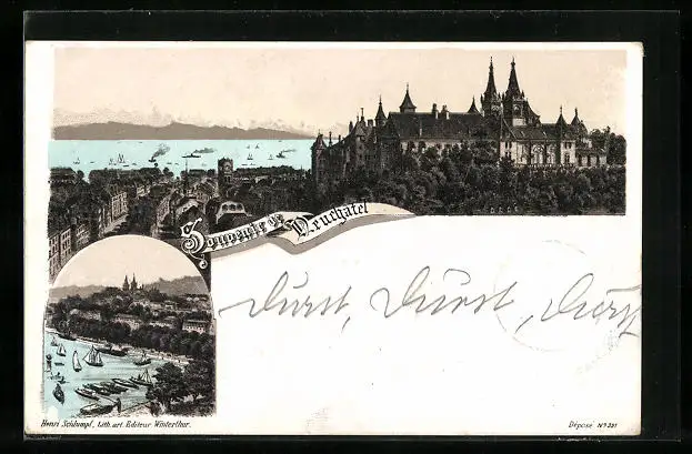 Lithographie Neuchâtel, Teilansicht, Uferpartie