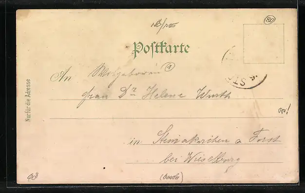 Personenbezogene Daten auf der Rückseite der Karte wurden durch blauen Textmarker unkenntlich gemacht. Die blauen Stellen sind auf die Vorderseite durchgeweicht und wirken sich negativ auf das Postkartenfoto aus