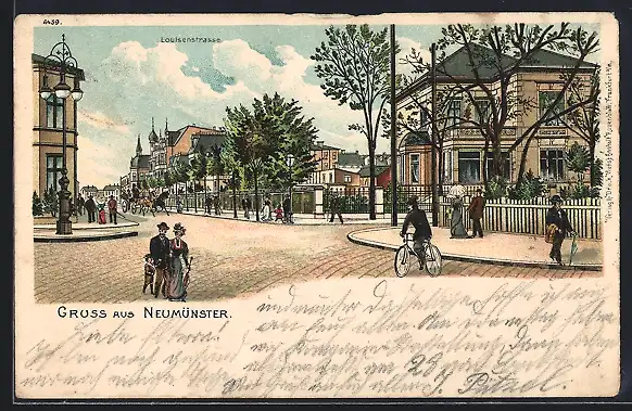 Lithographie Neumünster, Flaneure und Radfahrer in der Louisenstrasse