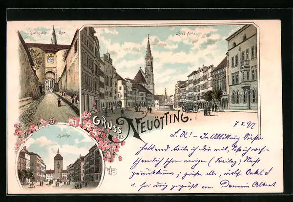 Lithographie Neuötting, Stadtplatz, Landshuter Thor, Stadtthor