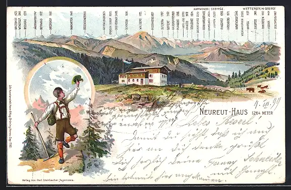 Lithographie Neureut-Haus, Gasthaus mit Bergpanorama