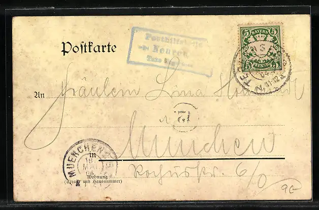 Personenbezogene Daten auf der Rückseite der Karte wurden durch blauen Textmarker unkenntlich gemacht. Die blauen Stellen sind auf die Vorderseite durchgeweicht und wirken sich negativ auf das Postkartenfoto aus