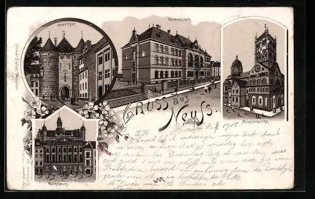 Lithographie Neuss, Gymnasium, Obertor, Rathaus