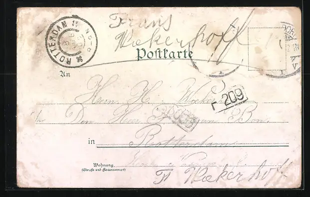 Personenbezogene Daten auf der Rückseite der Karte wurden durch blauen Textmarker unkenntlich gemacht. Die blauen Stellen sind auf die Vorderseite durchgeweicht und wirken sich negativ auf das Postkartenfoto aus