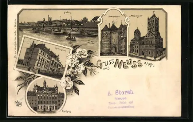 Lithographie Neuss a. Rh., Hafen, Oberthor, Münster, Gymnasium und Rathaus