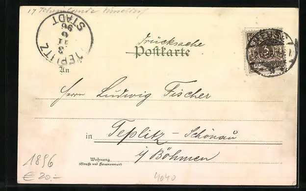 Personenbezogene Daten auf der Rückseite der Karte wurden durch blauen Textmarker unkenntlich gemacht. Die blauen Stellen sind auf die Vorderseite durchgeweicht und wirken sich negativ auf das Postkartenfoto aus